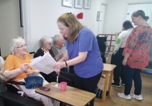 We use bespoke large print song sheets produced in-house. A laptop connected in to the large screen TV often found in the care home lounges is also an option to provide song lyrics and anything else.